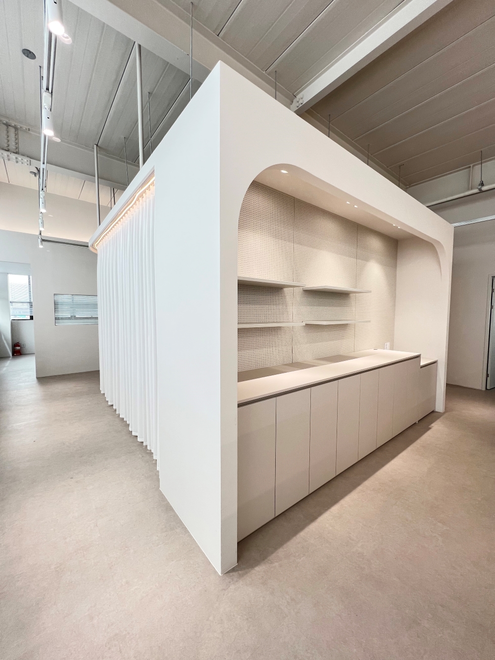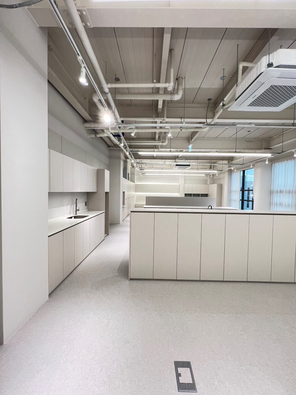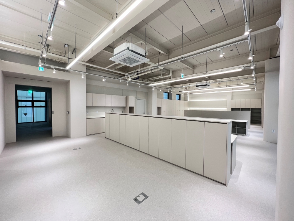 김포 양촌리에 위치한 명인 화장품의 새로운 보금자리는 ‘Clean & Professional’을 핵심 키워드로 설계되었습니다. 화장품 브랜드가 지향하는 순수함(Pure)을 화이트 톤의 가구와 바닥재로 시각화하고, 노출 천장을 통해 45평 이상의 확장된 개방감을 부여했습니다.