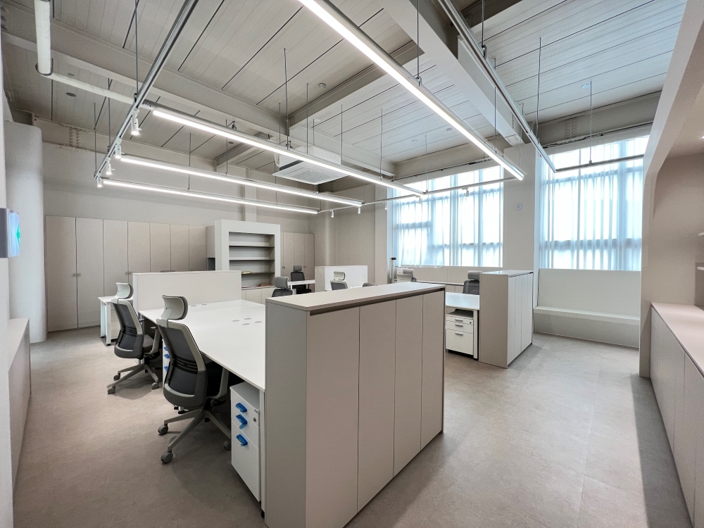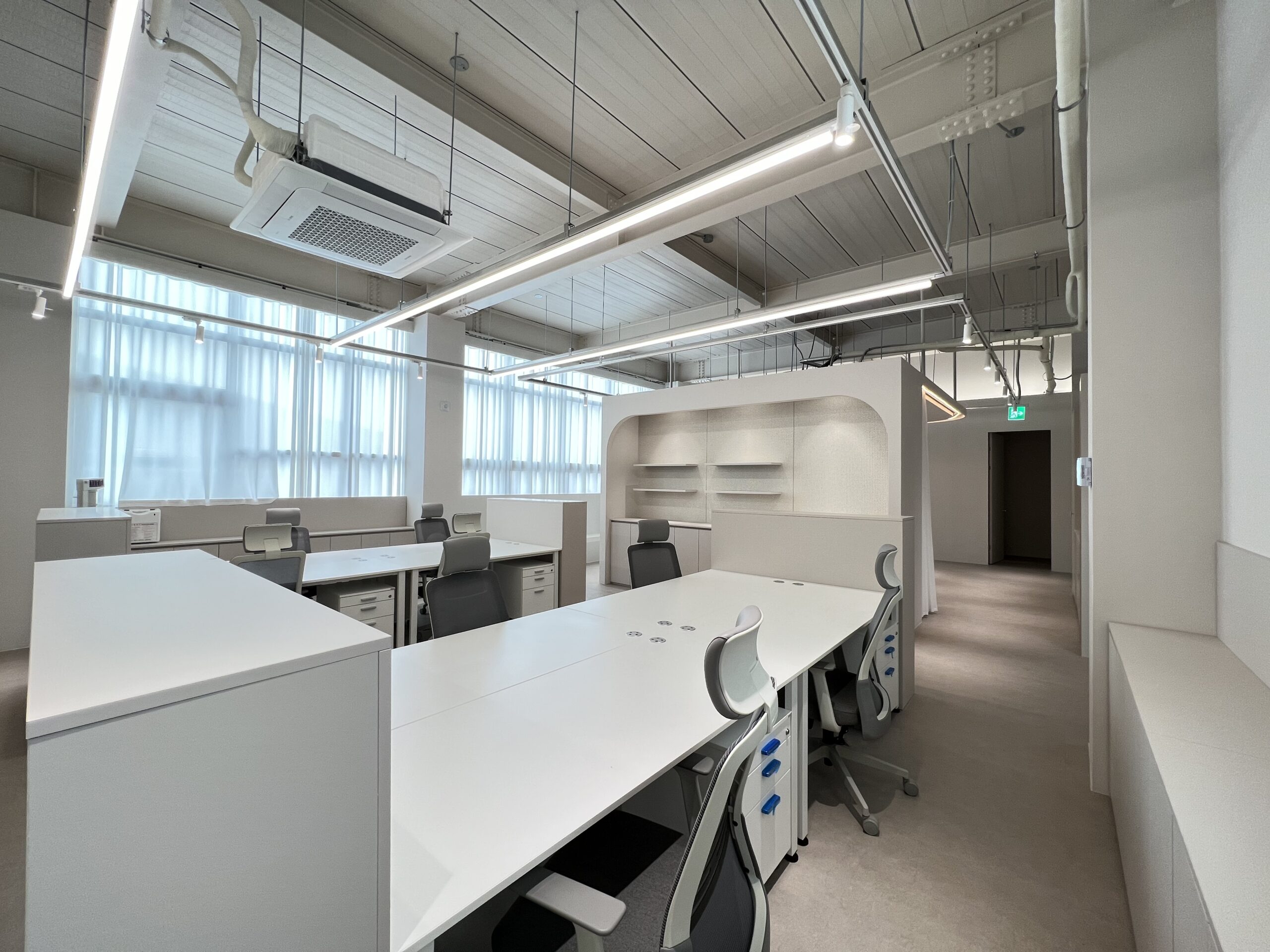 직원들의 창의적 업무를 지원하는 개방형 데스크 배치와 간결한 라인의 조명 시스템은 효율적인 업무 환경을 조성합니다. 특히, 상단에 노출된 배관과 레일 조명은 현대적인 인더스트리얼 감성을 더해 기업의 역동성을 상징적으로 나타냅니다.