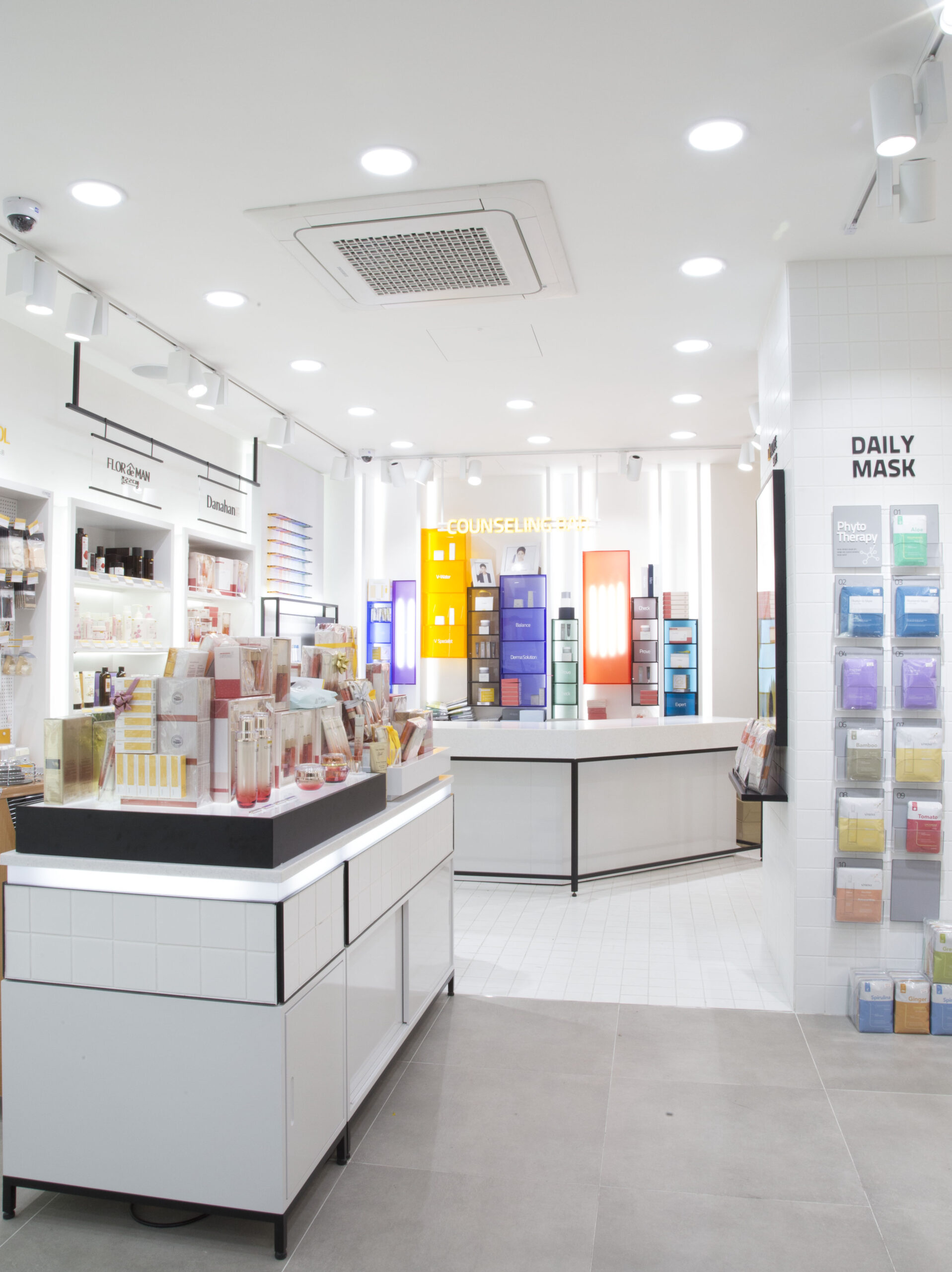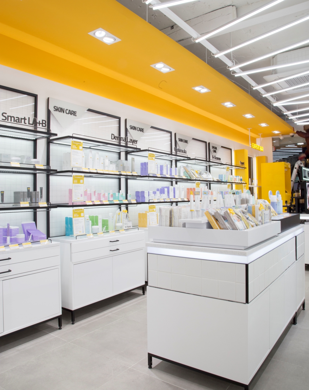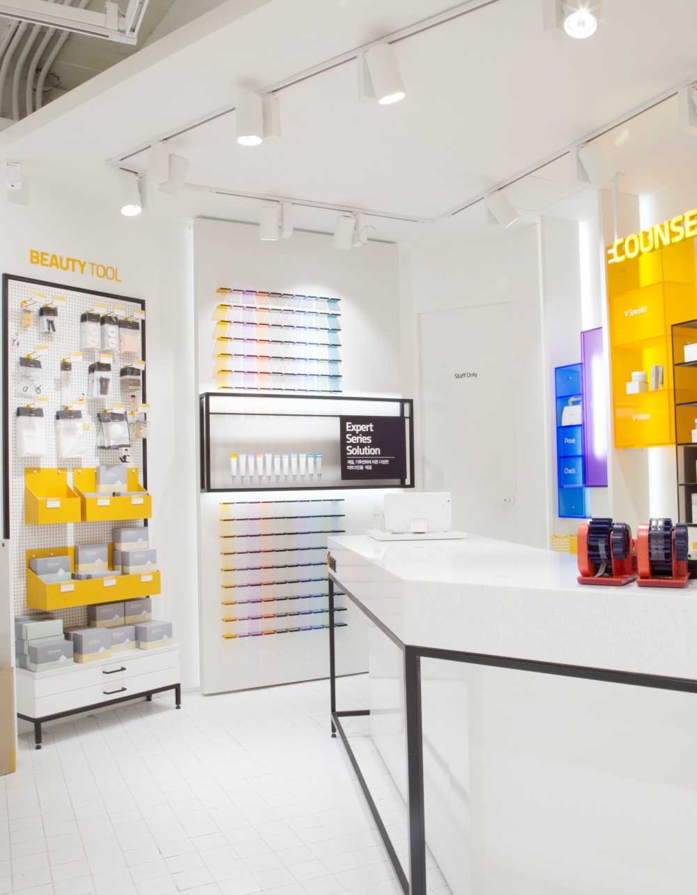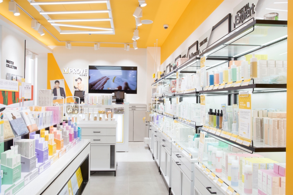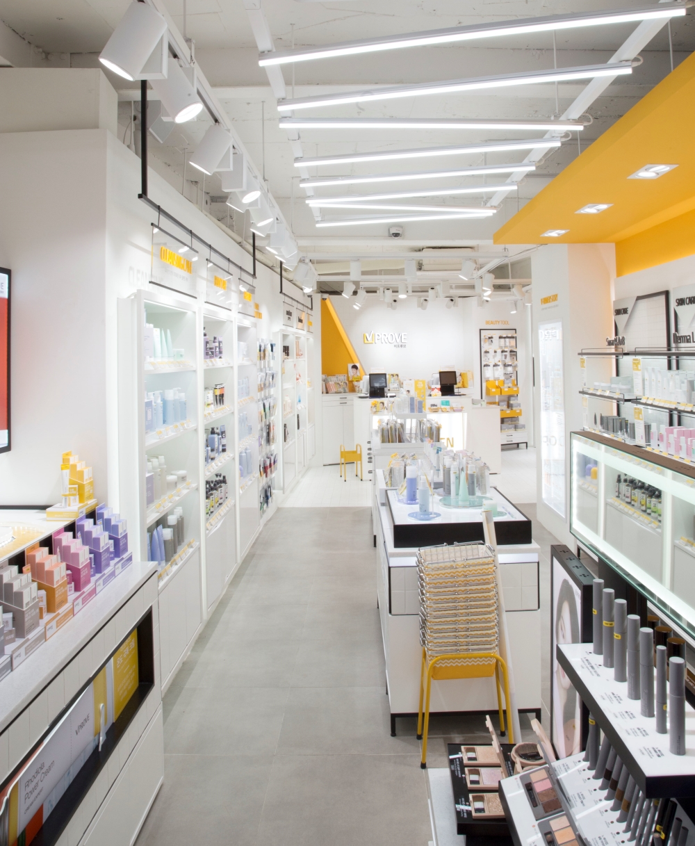 대한민국 뷰티의 메카인 명동의 중심에서 비프루브(VPROVE)가 지향하는 ‘더마 코스메틱’의 전문성을 공간적으로 재해석한 프로젝트입니다. 브랜드 시그니처인 옐로우와 화이트 톤의 강렬한 대비를 통해 공간의 가시성을 극대화했으며, 천장을 가로지르는 리드미컬한 라인 조명은 역동적인 쇼핑 동선을 유도합니다. 또한 체계적인 격자형 모듈 선반 시스템을 도입하여 방대한 제품군을 효율적으로 큐레이션 함으로써 브랜드의 신뢰도를 높였습니다. 디자인디닷은 복잡한 상업 지구 내에서도 브랜드의 아이덴티티를 직관적으로 전달하고 고객의 몰입을 이끌어내는 고기능성 리테일 공간을 완성했습니다.