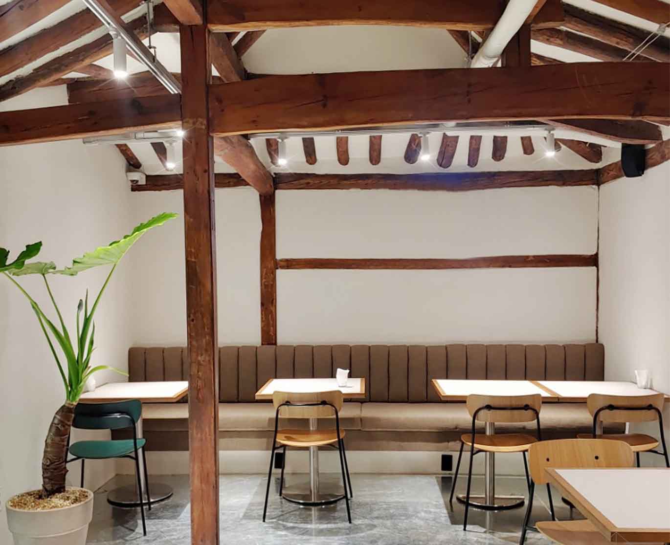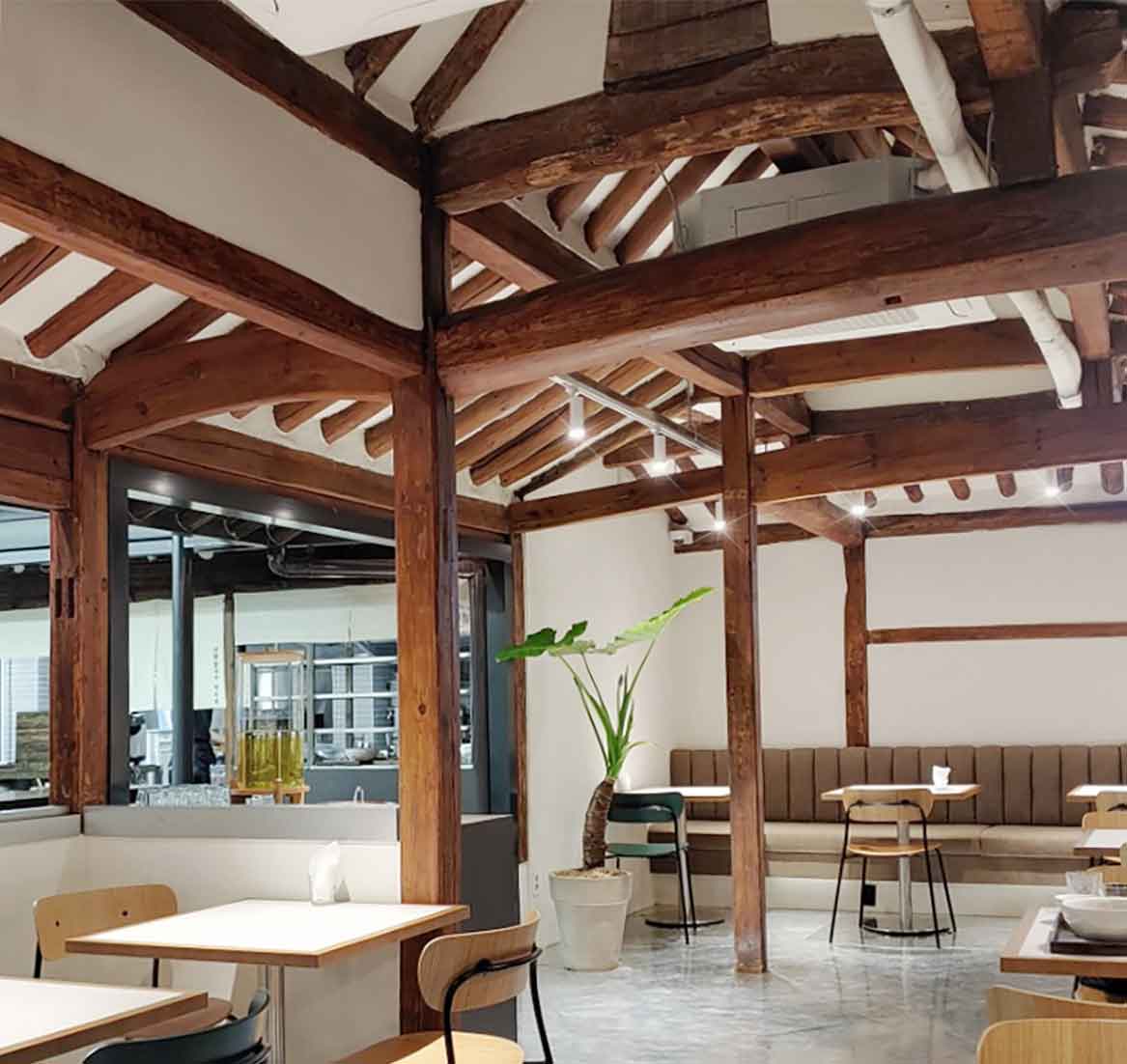 용산의 오래된 한옥을 개조한 ‘미미옥’은 과거의 유산과 현재의 라이프스타일이 공존하는 뉴트로(New-tro) 공간의 정수를 보여줍니다. 40평 규모의 공간을 지탱하는 본연의 서까래와 기둥은 그대로 살려 한옥 특유의 따스한 정서를 유지하되, 하부 공간은 미니멀한 화이트 벽면과 노출 콘크리트 바닥을 적용하여 반전의 미학을 완성했습니다.